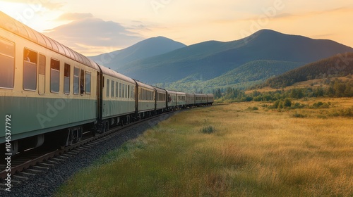 Fototapeta premium Scenic view of a train traveling through a tranquil landscape, surrounded by mountains and fields during sunset.