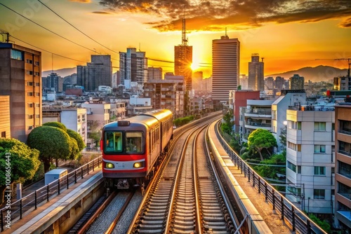 Naklejka premium Scenic view of a urban train traveling through a vibrant cityscape during the...