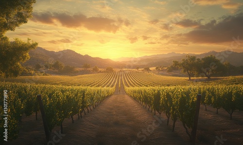 Naklejka premium Scenic view of a vineyard at sunset, rows of grapevines stretching into the...