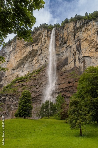 Fototapeta premium Scenic view of a waterfall cascading down a cliff. Lauterbrunnen Switzerland
