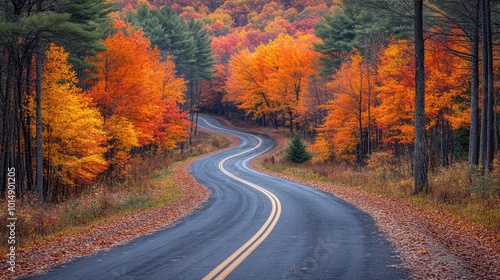 © Teerasak, Obraz premium Scenic view of a winding road through autumn trees, captured from a distance, showcasing the beauty of fall foliage