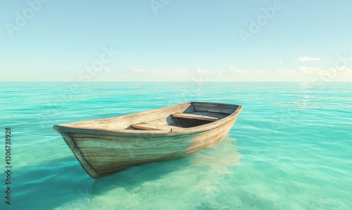© Valentyna, Naklejka premium Scenic view of a wooden boat floating on turquoise water under clear skies, illuminated by bright natural light for a serene and exotic feel