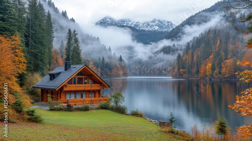 © Lume Origin Visuals, Fototapeta premium Scenic View of a Wooden House by a Serene Alpine Lake Surrounded by Autumn Colors and Majestic Mountains under a Mysterious Fog