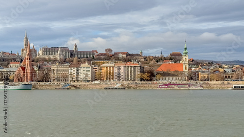 Fototapeta premium Scenic view of Budapest's historic architecture along the Danube River,...
