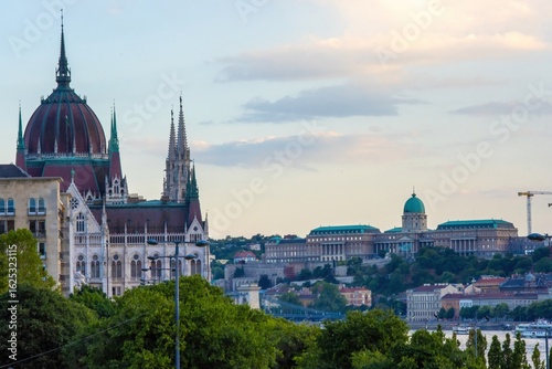 © Robert, Fototapeta premium Scenic view of Budapest’s historic city center and iconic Parliament building, captured from Margaret Bridge over the Danube River.