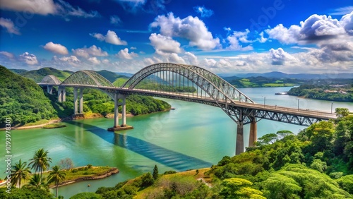© Danicha, Fototapeta premium Scenic View of Centennial Bridge, Puente Centenario, Spanning the Panama Canal with Lush Surroundings and Clear Sky, showcases the Engineering Marvel of the PanAmerican Highway