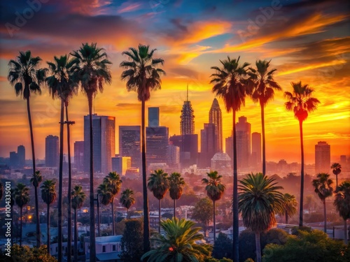 Obraz premium Scenic view of classic Los Angeles skyline with palm trees and sunset reflecting on the cityscape