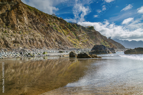 Fototapeta premium Scenic view of coastal cliffs reflected in the calm sea in Playa Benijo,...