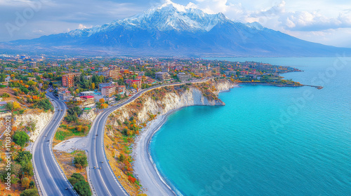 © PuriStudio, Naklejka premium scenic view of coastal road winding along turquoise sea, with snow capped mountains in background. vibrant landscape showcases blend of nature and urban life