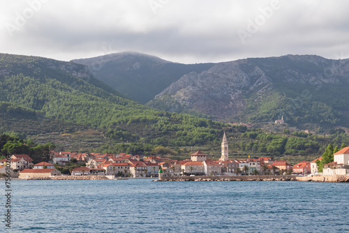 © Chris, Fototapeta premium Scenic view of coastal town Jelsa on Hvar island in Dalmatia, South Croatia, Europe. Coastline of Adriatic Sea seen from boat tour in Balkans. Arriving in idyllic port in Mediterranean architecture
