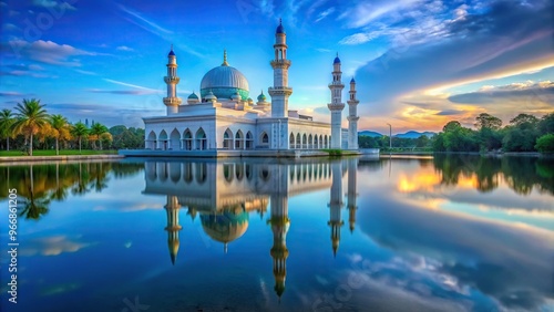 © methinee, Naklejka premium Scenic view of crystal clear blue stream in front of mosque