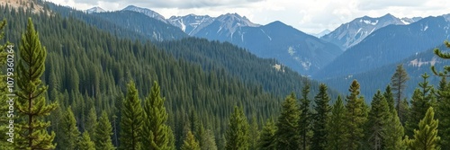 Fototapeta premium Scenic view of dense pine forest in the rugged wilderness mountains, green,...