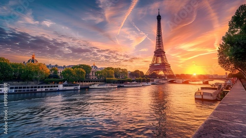 © Nicholas, Obraz premium Scenic view of Eiffel Tower over Seine River during dramatic sunset, Paris, France