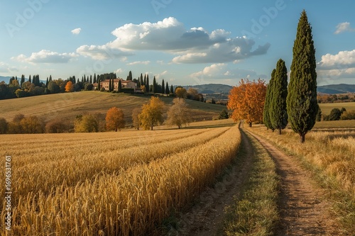Obraz premium Scenic view of farmland, rolling hills, and foliage during the autumn season