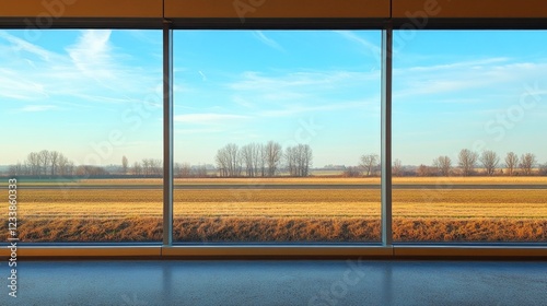 Fototapeta premium Scenic View of Fields and Trees Through Large Modern Windows in a...