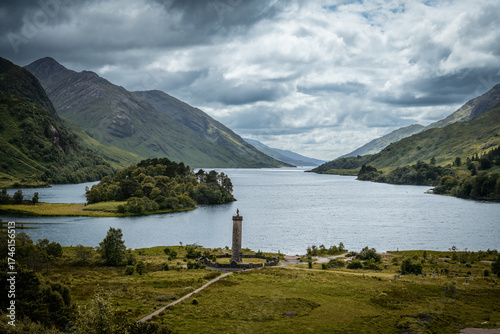 © Pedro, Fototapeta premium Scenic View of Glenfinnan Monument and Loch Shiel under Cloudy Sky in the Scottish Highlands - Scotland