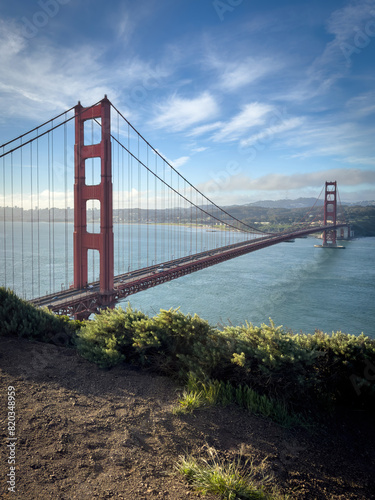 © A. Emson, Naklejka premium Scenic view of Golden Gate Bridge and cityscape of San Francisco, California, USA at sunrise against blue sky with clouds