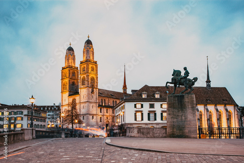Naklejka premium scenic view of historic Zurich city center with famous Grossmunster Churches...