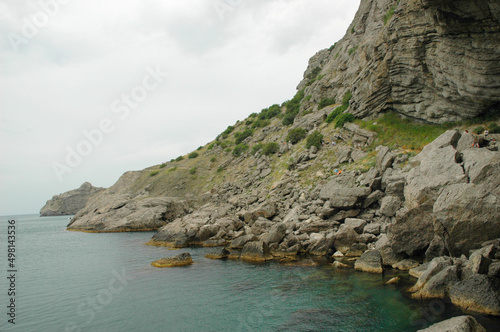 © Julia, Fototapeta premium Scenic view of huge cliffs and sea. Sea bay surrounded by rocky mountains. The Black Sea coast is surrounded by rocks and mountains. Rocky shore, ripples on the sea water. Crimea. The Golitsyn Trail
