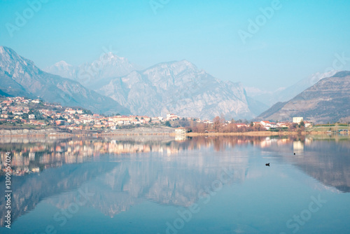 Fototapeta premium Scenic View of Lago di Annone with Monte Resegone and Civate in the Background