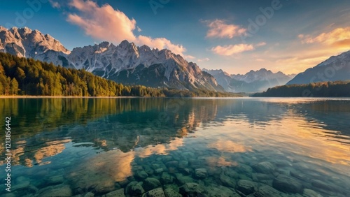© Impact Design, Naklejka premium Scenic view of lake against sky during sunset. Sunny outdoor scene in German Alps, Bavaria, Germany, Europe. Beauty of nature concept background