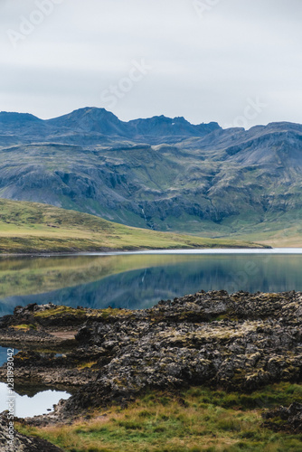 © _mishamartin, Fototapeta premium Scenic view of Lake Hraunsfjardavatn reflecting mountains in Berserkjahraun, Snæfellsnes Peninsula, West Iceland