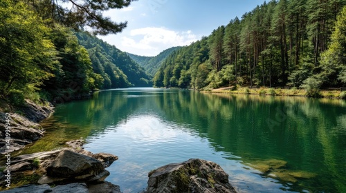 © Jiraporn, Fototapeta premium Scenic view of lake in pine forest beside nature park concept. Serene lake surrounded by lush green trees and mountains.