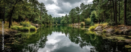 Fototapeta premium Scenic view of lake in pine forest with mountain and park concept. Serene lake reflecting trees under a moody sky.