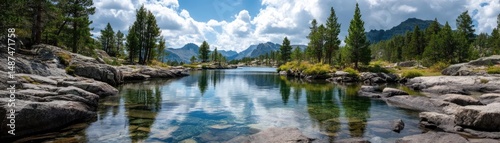 © Tin, Fototapeta premium Scenic view of lake in pine forest with rock and trees concept. Scenic view of a tranquil lake surrounded by majestic mountains.