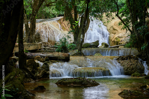 © Anucha, Obraz premium Scenic view of limestone waterfall in forest