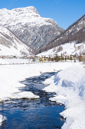 Fototapeta premium Scenic view of Livigno village in Sondrio province, Italy in winter. Popular skiing resort in European Alps. Snowcapped mountains, water stream and houses