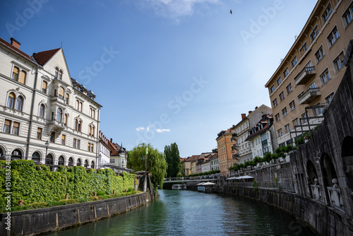 Naklejka premium Scenic view of Ljubljana's riverside architecture featuring classical buildings, stone embankments, and tranquil green waters under bright summer sky in Slovenia's capital