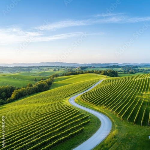 © Wanida, Fototapeta premium Scenic View of Lush Green Hills and Curving Road in a Serene Landscape with Vineyards and Rolling Fields Under a Bright Blue Sky