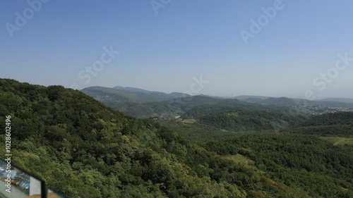 Obraz premium Scenic view of lush green hills and distant mountains.
