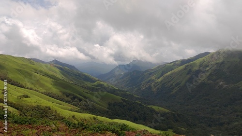 Obraz premium Scenic view of lush green mountains under a cloudy sky