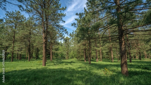 © The 2R Artificiality, Obraz premium Scenic view of lush green pine trees in summer