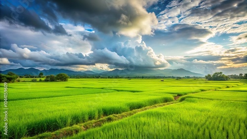 © Latsamee, Obraz premium Scenic view of lush green rice field under cloudy sky
