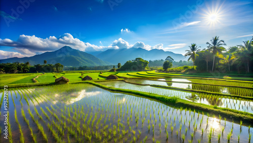 Obraz premium Scenic view of lush rice paddies under a clear blue sky, agriculture,...