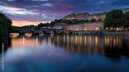 © Mselected, Naklejka premium Scenic view of Lyon under evening sky with reflections in river
