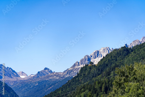 Fototapeta premium Scenic view of mountain Valley Bedretto in the Swiss Alps with mountain peak on a sunny late summer day. Photo taken September 10th, 2023, Gotthard, Canton Ticino, Switzerland.