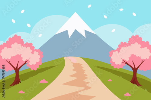 © AIYAL BI, Fototapeta premium Scenic view of mountain with cherry blossom trees
