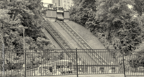 Fototapeta premium Scenic view of Niagara Falls funicular on rails transporting tourists to...
