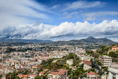 © Wirestock, Fototapeta premium Scenic view of Nice, France with a backdrop of mountains and a partly cloudy sky.