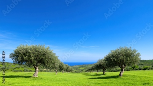 Obraz premium Scenic view of olive trees with a blue sky and ocean backdrop.