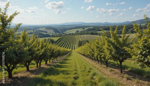 © Kitta Studio, Fototapeta premium Scenic View of Orchard Rows with Greenery and Blue Sky
