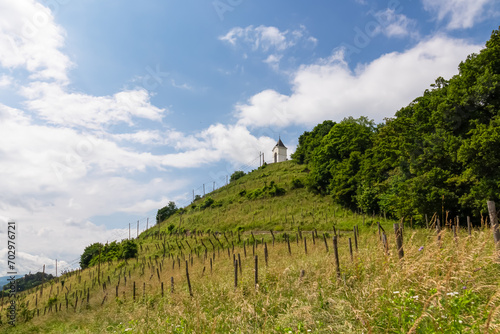 Naklejka premium Scenic view of Piramida (Pyramid Hill). Elevated spot in the heart of city Maribor, Slovenia, Europe. Harmonious fusion of natural beauty featuring vineyards and small Christian chapel on summit
