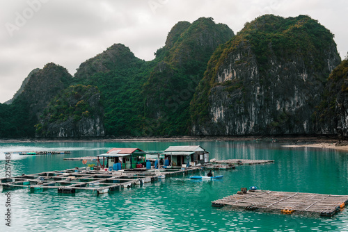 © Josep, Fototapeta premium Scenic view of rocks and local fishing boat in the Ha Long Bay of the South China Sea, Vietnam. The Ha Long Bay is a popular tourist destination of Asia.