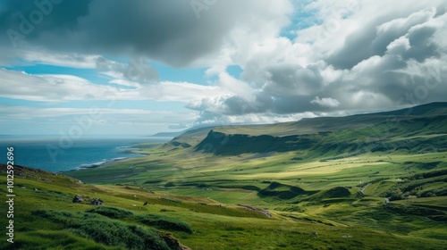 Naklejka premium Scenic View of Rolling Green Hills and Blue Ocean