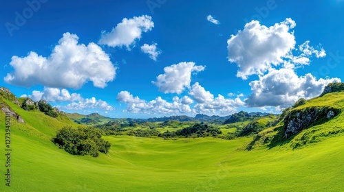© AZ Studio, Fototapeta premium Scenic view of rolling green hills under a bright blue sky with fluffy clouds during the daytime