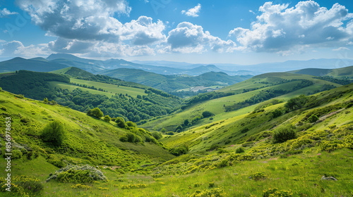 © M, Naklejka premium Scenic view of rolling hills, lush green valleys, scattered trees, and blue sky with fluffy clouds